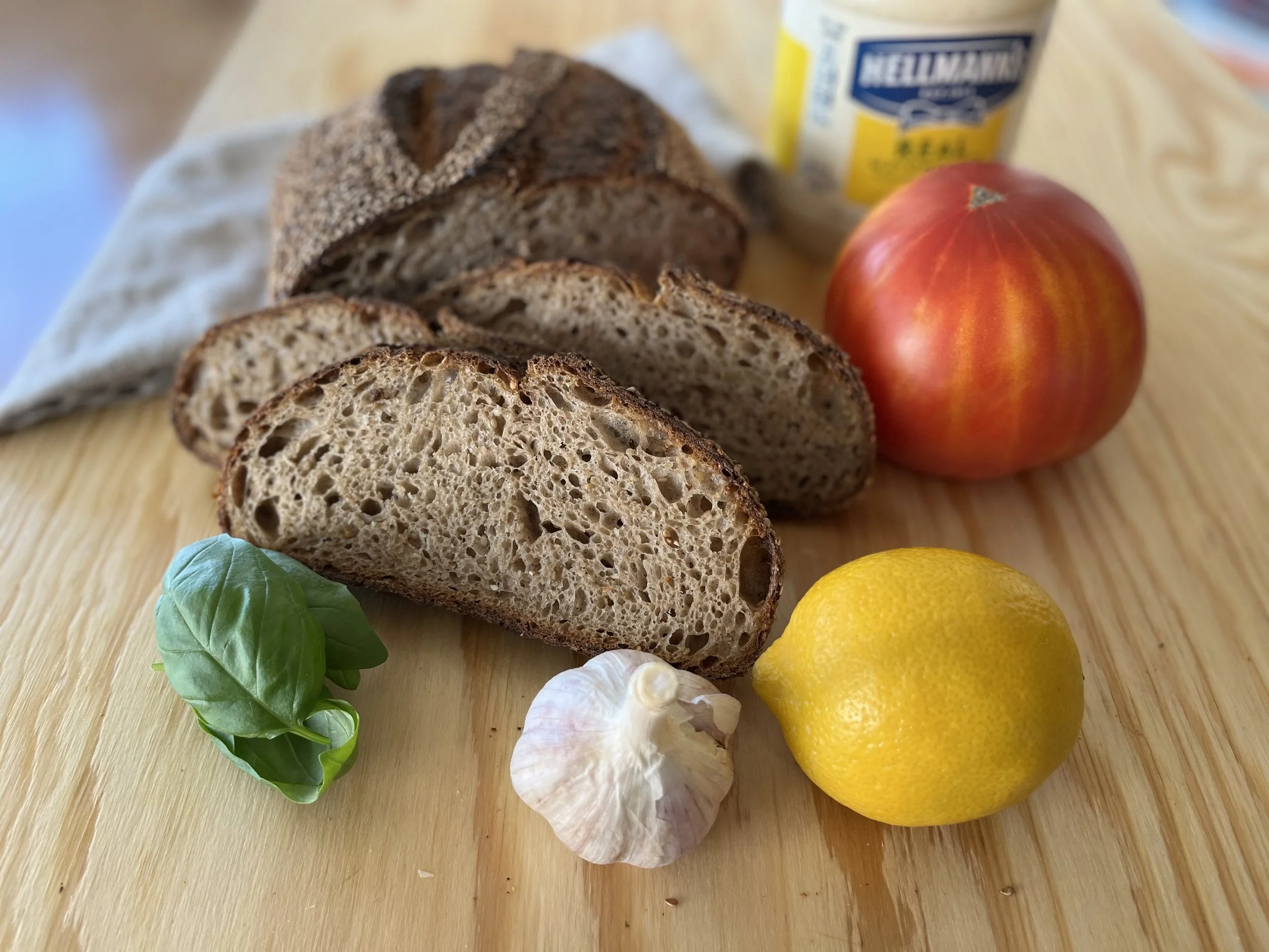 Slice and put bread in the toaster. While bread toasts, mix mayonnaise, lemon juice, grated garlic, and a few cracks of pepper in a small bowl. Slice tomato into about 1/4-1/2 inch rounds.